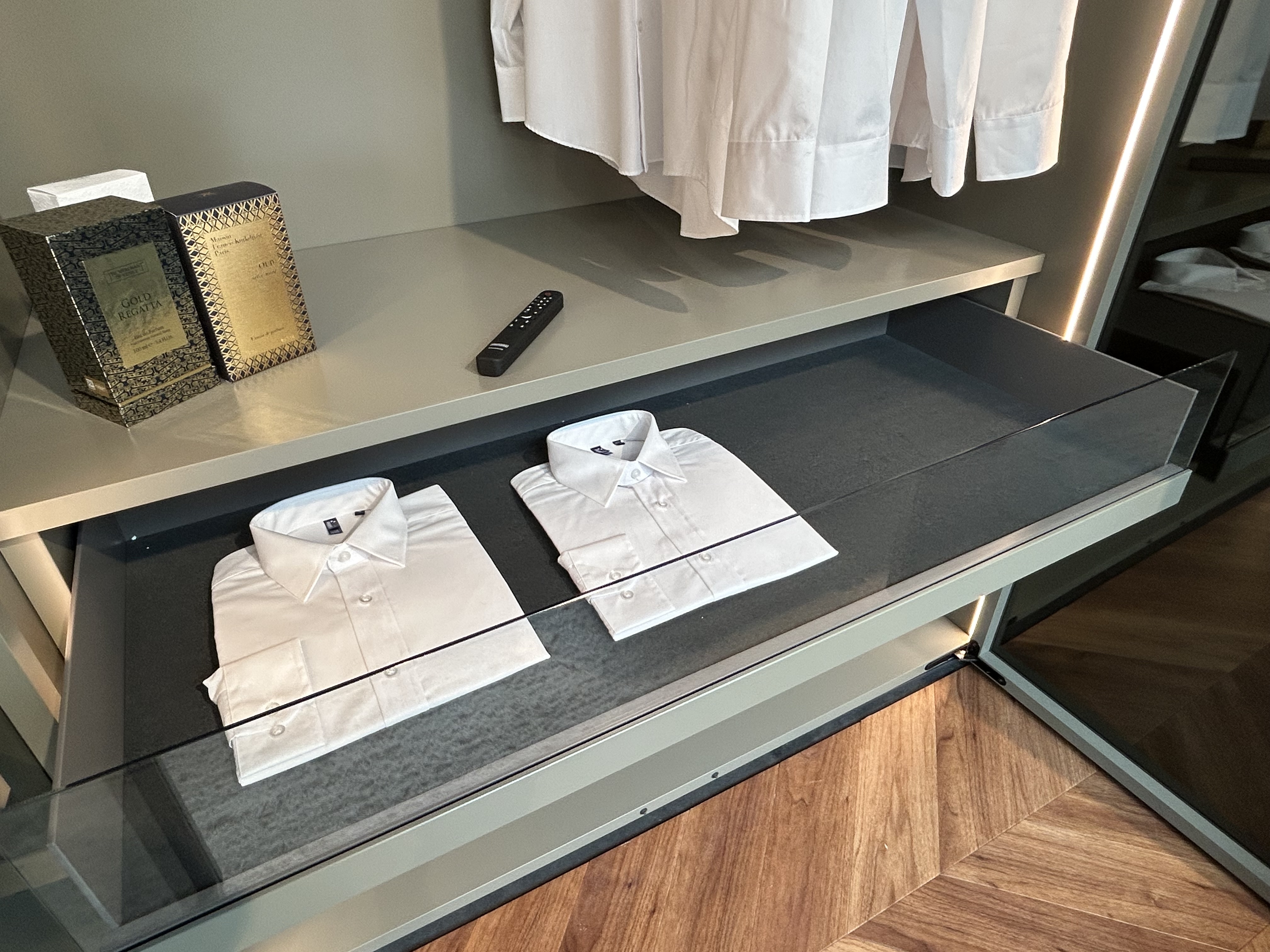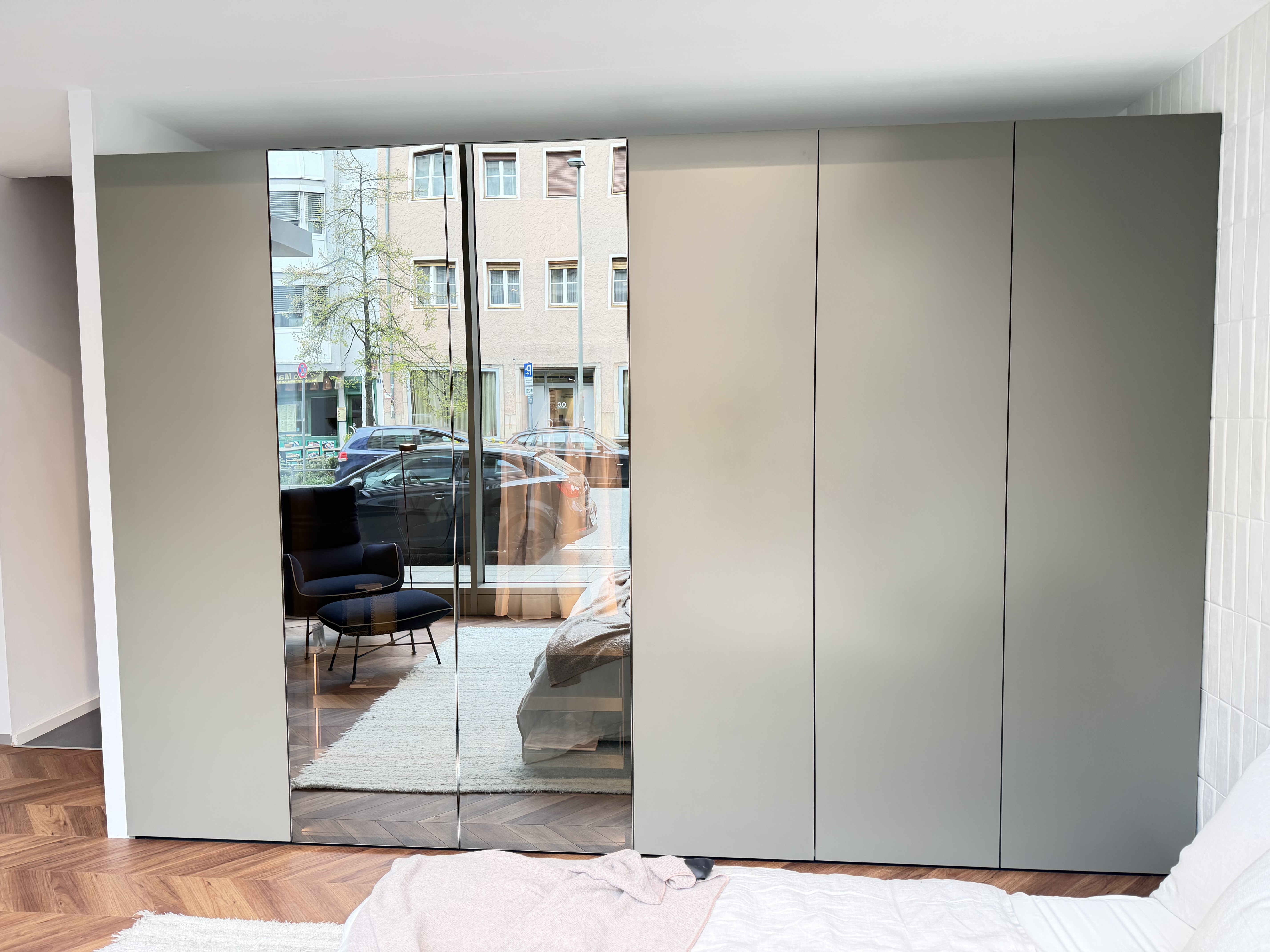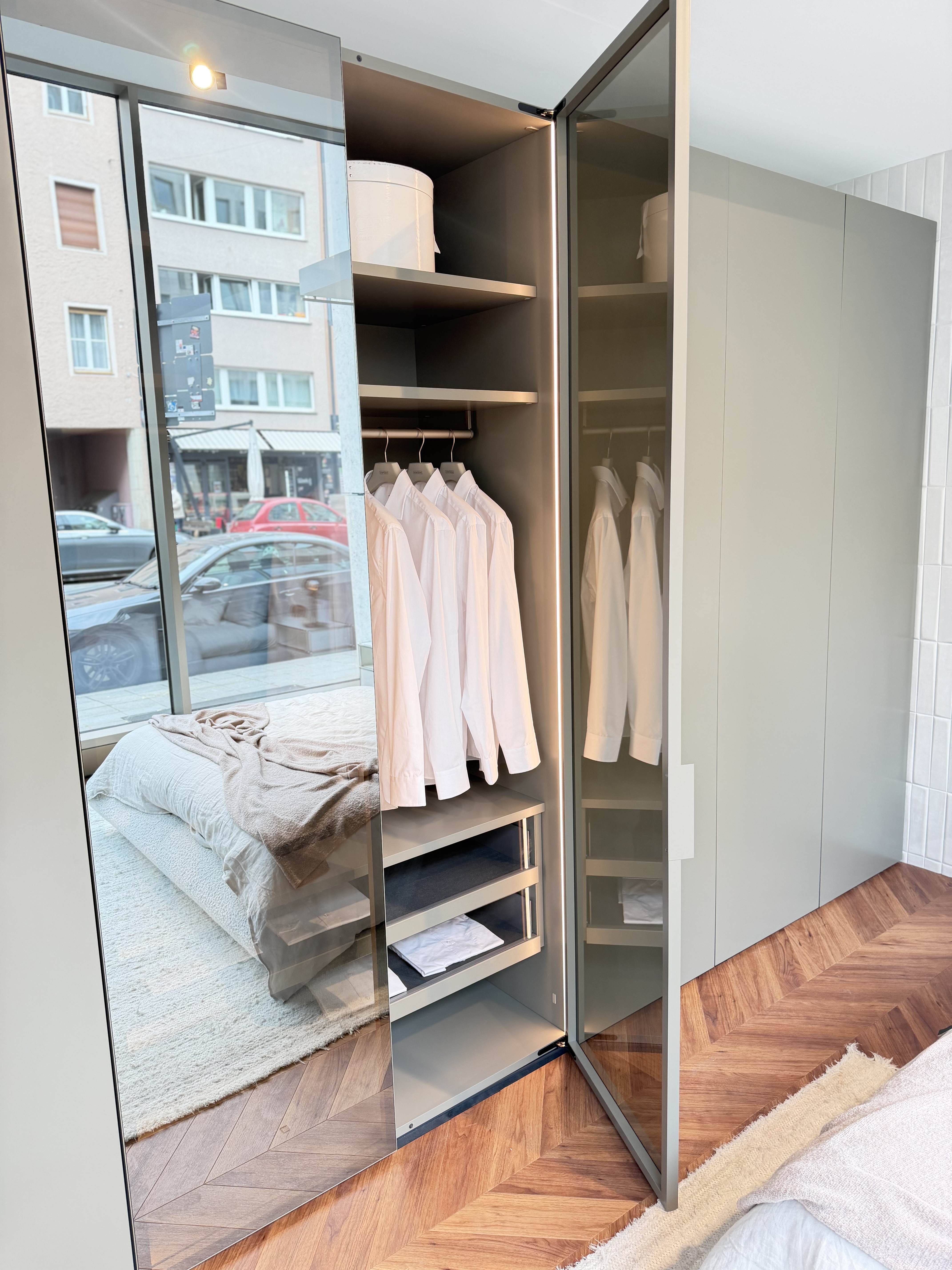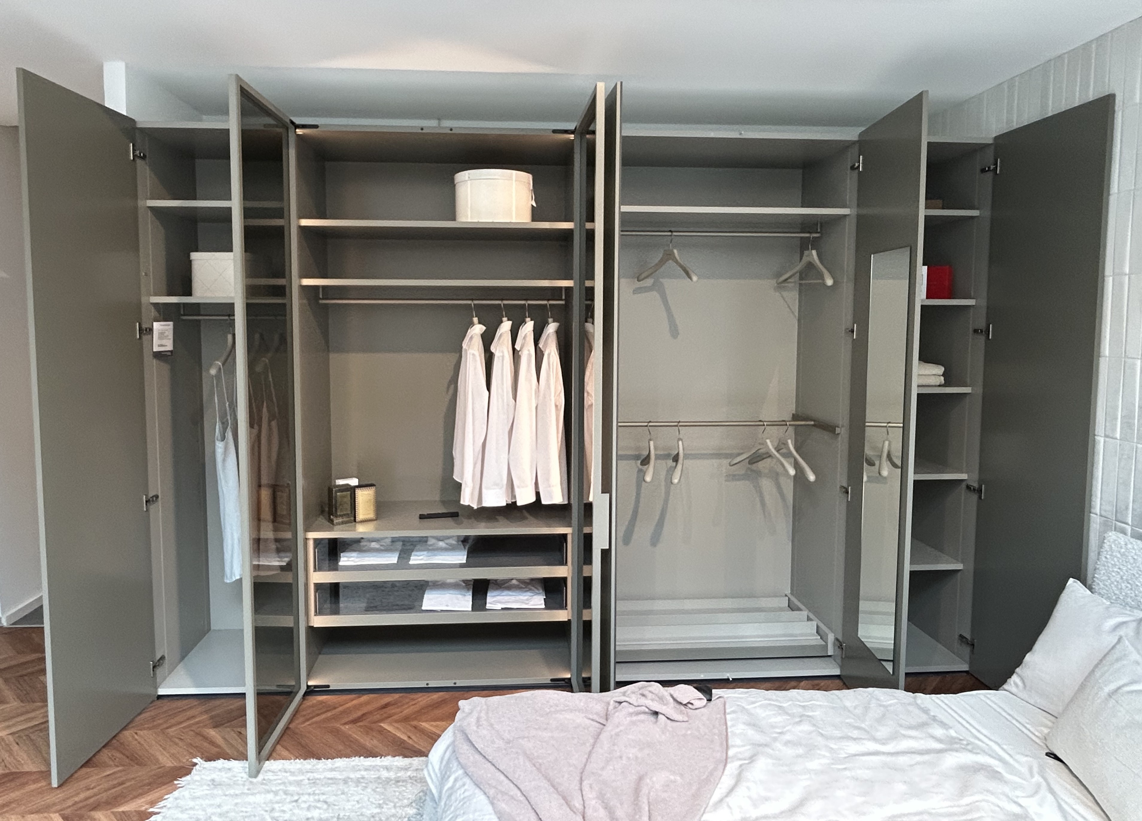 Kleiderschrank Collect Plus von Interlübke, Drehtüren mit Push-to-open-Beschlag, Vitrinen-Element mit Beleuchtung,